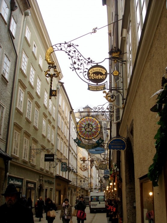 町のメインストリートであるゲトライデガッセは、ザルツブルクのハイライトと言っても良いでしょう。両脇にはレストランや衣類を扱う店、時計店などが並び、狭い通りはいつも大勢の人で賑わっています。