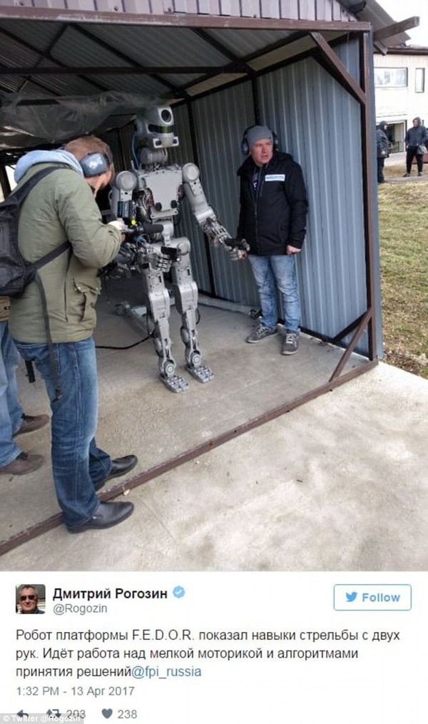 — Дмитрий Рогозин (@Rogozin) 2017年4月13日Робот платформы F.E.D.O.R. показал навыки стрельбы с двух рук. Идёт работа над мелкой моторикой и алгоритмами принятия решений@fpi_russia pic.twitter.com/jREgpgEy14