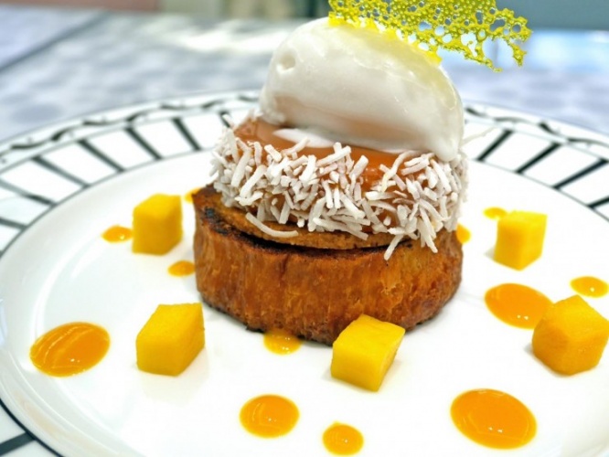 宮崎マンゴーを使用したデセール ア ラシェットは、ココナッツがほんのり香るパンペルデュの上に、ココナッツがあしらわれたカラメル風味の濃厚なクリームと、ココナッツのソルベが乗った見た目も美しいデザート。