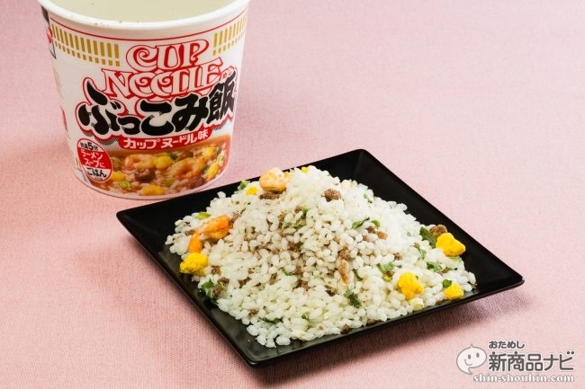 まずは日清食品を代表する国民的カップ麺がベースになっている『カップヌードル ぶっこみ飯』(内容量90g・希望小売価格 税抜220円・発売中)から食べてみよう。お馴染みのパッケージに堂々と「ぶっこみ飯」と書かれており、通常のカップヌードルよりカップに横幅がある。
