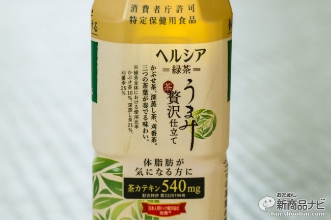 緑茶全体の比率としては、かぶせ茶10%、深蒸し茶21%、刈番茶25%を使用。茶カテキンは「ヘルシア緑茶a」同様、500mlあたり540mg含んでいる。
