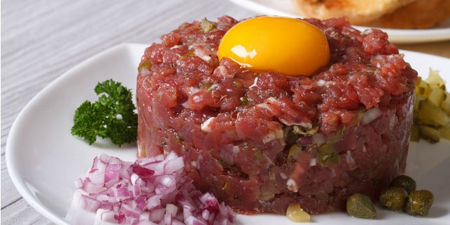 肉は十分(中心温度が75℃で1分以上)加熱して食べましょう。冷凍しても死なないとされています。外食では鳥刺し、レバ刺し、ユッケなどに注意します。