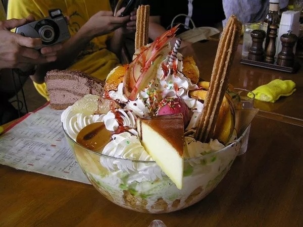 いくら「デザートは別腹」と豪語している女子でもこのスイーツの前では、太刀打ちが出来ないでしょう。パフェですが、よく見るとケーキがそのままトッピングされていますね。これは太ります。