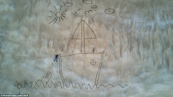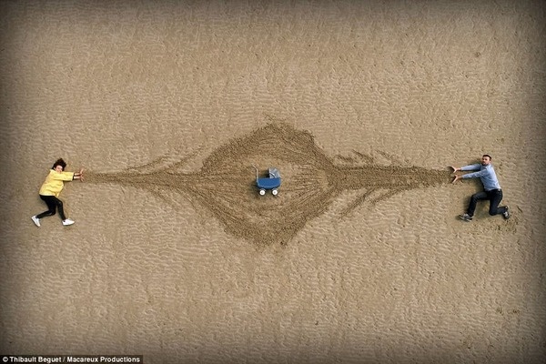 砂浜に描かれたヨットに子供が一生懸命捕まっています。