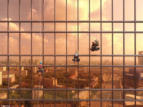 ロシアのモスクワで撮影された夜明けの窓清掃作業員を撮影した風景です。
