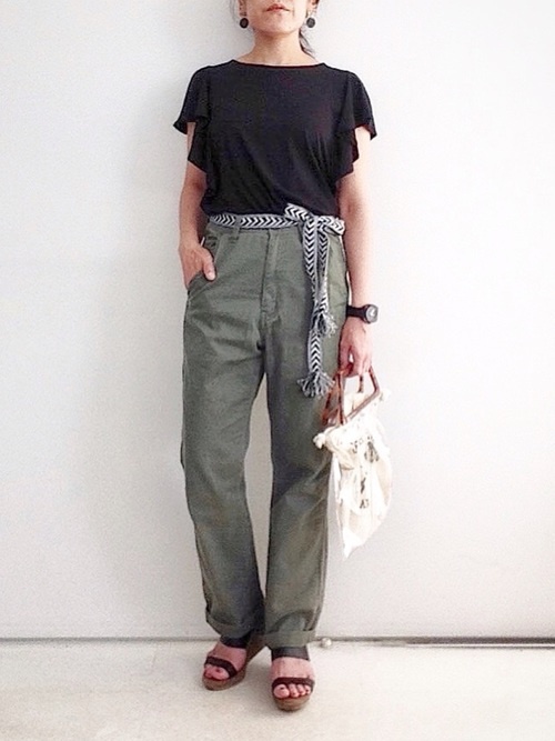 「フリルスリーブT」は揺れる袖のデザインが女性らしく、気になる二の腕もカバーしてくれます。丈も長めなのでボトムにインしてもチュニックにして着てもOK。