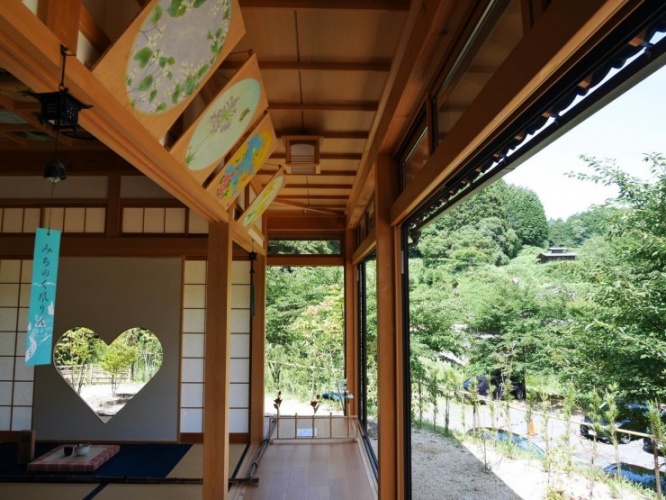 尚、猪目窓は、春にはサクラでピンクに、夏は葉で緑に、秋はドウダンツツジでほんのり赤に、冬は雪で白のように、いつ訪れても四季折々の表情を楽しむことができます。