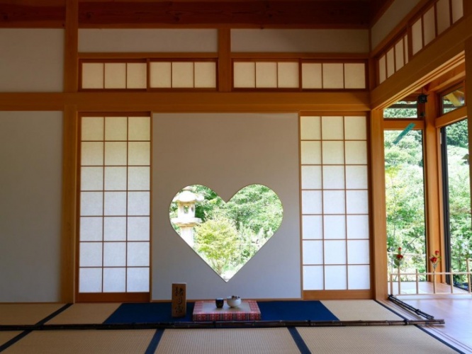 正寿院に行ったら絶対に見学していただきたい場所は、客殿の「猪目窓」。猪目(いのめ)とは、日本古来から使われているハートの形によく似ている図柄です。