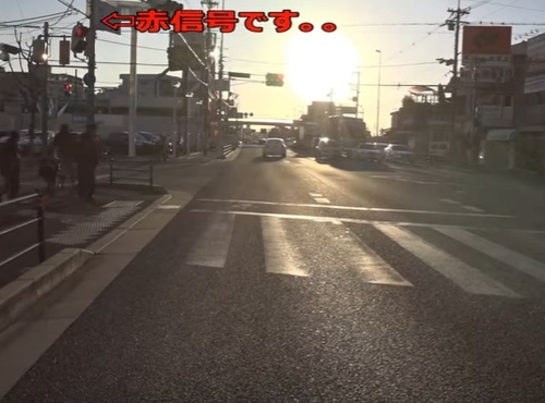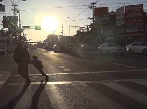 赤信号の道路に、歩きスマホをしながら親子がやって来たが・・・。