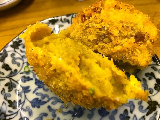 カレーコロッケは、ラードでカラっと揚げられており、スパイシーな味わいがあとひく美味しさ。