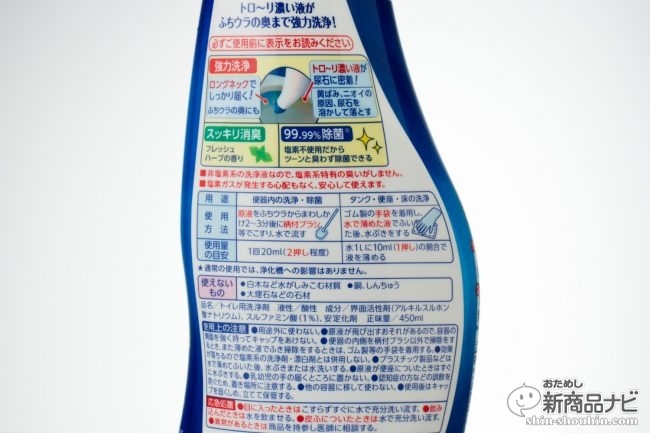 液体はとろみのある粘度の高いブルー。近年主流のL字型の噴出口で、便器のフチ裏に楽に噴射できる。実際に使ってみると、多めに使用した場合、水を流しても青みが残ってしまうくらい強力な粘度。実に頼り甲斐がある。2〜3分放置してブラシでこすって汚れを落とすという使い方なのだが、実際はほとんどの汚れは普通に水を流せばきれいに洗い流されてしまうのがポイント。これは気軽に使用できる。