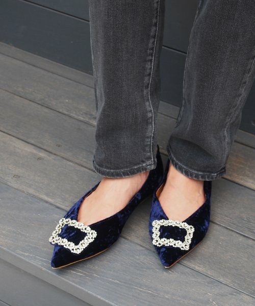 「PIPPICHIC(ピッピシック)」のパンプスはビジュー×ベルベットというクラシカルな組み合わせですが、シャープなV字カットのポインテッドトゥが今っぽいムードも。