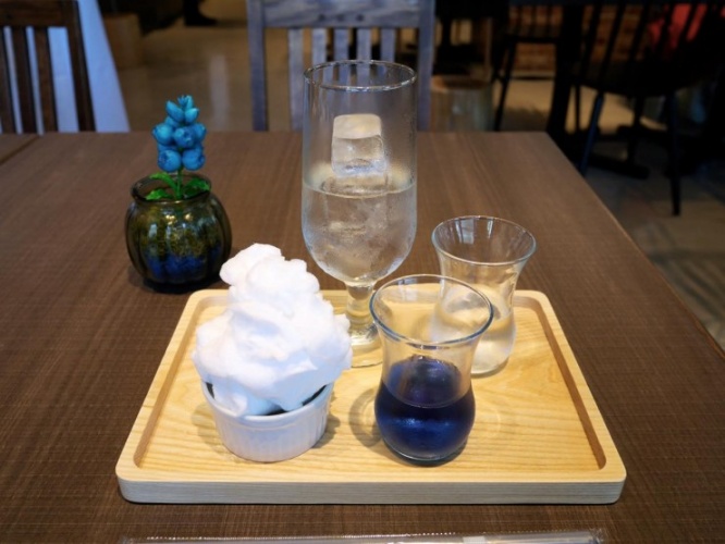ブルーのドリンクの正体はハーブティー。この暗闇色のハーブティーを、グラスに入ったソーダ水に注ぐと、グラスの中が、暗闇から夕焼けに変わります。夜から夕方に時間を戻す魔法です。