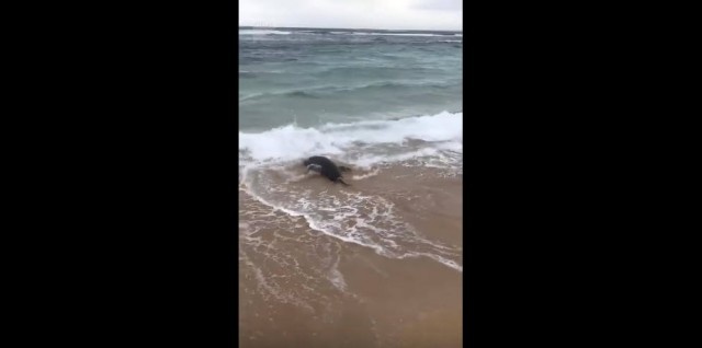 自分が人間に囲まれていると理解すると硬直し、その後逃げるように海へと戻っていく。