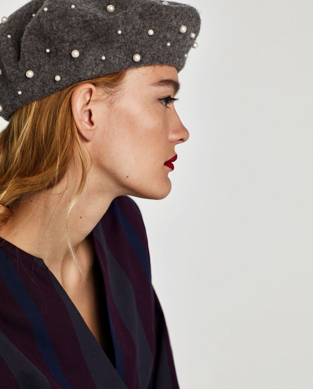 トレンドのベレー帽にも愛らしい小粒パールを散りばめて。