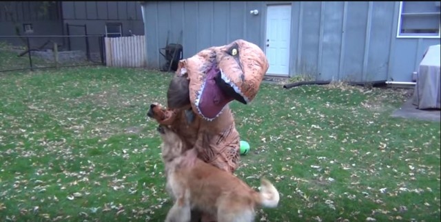 突如やってきた恐竜(着ぐるみ)に、ワンちゃんが立ち向かう!