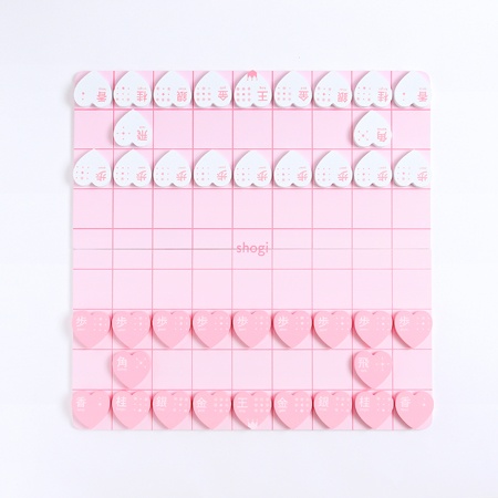 「♡shogi」はご覧のように、駒を大胆にハート型にしちゃった可愛い将棋。将棋盤もパステルピンクに彩られていてトキメキが抑えられない♪