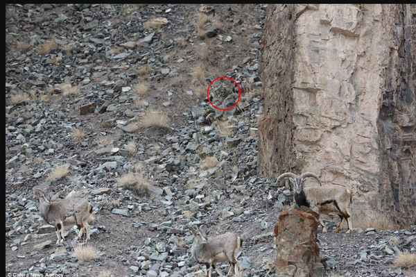 こちらは、インドのラダックで写真家Inger Vandykeが撮影したものです。一見、羊が写っているだけの写真の様に見えますが、よーく見てみると実はそれを狙うユキヒョウがいるということです。パッと見てもそんなものは確認できないわけですが、確かにその場所を見てみると居ます。ということでこの中に隠れている「ユキヒョウ」を探し出してみて下さい。
