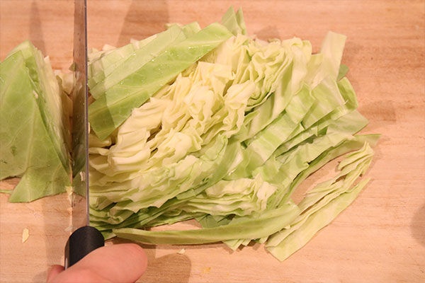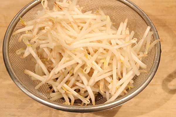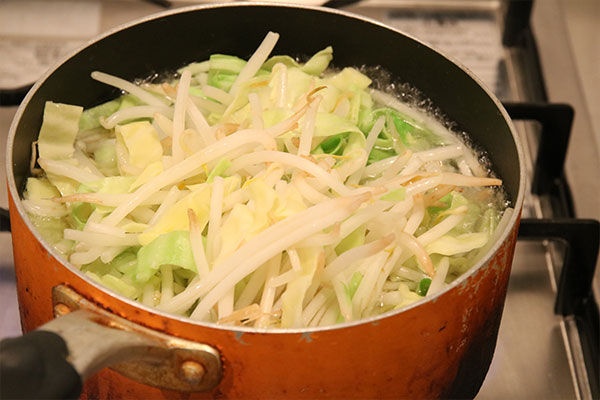 鍋に熱湯を沸かし、キャベツともやしを茹でる。