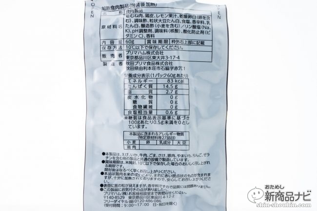 1パック60gあたり83kcal。タンパク質14.5g/脂質2.7g/糖質(炭水化物)0g。要冷蔵通常のパッケージを開けるとそこら中に液体が吹き出しがちなサラダチキンとは違って、そのままパパッと封を切り、パクッといけるワンハンド食べに特化したバー形状もまた手軽で、ダイエット中の小腹に最適化された商品だった。