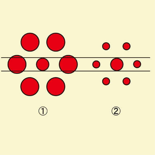 2番目の円の方が大きく見えていませんか。実際はどちらの円の大きさも同じです。2本の直線の間に中心にある円がしっかりとはいっています。