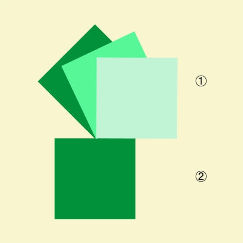 1番目の正方形の方が大きく見えていませんか。実際はどちらの大きさも同じです。1番目の正方形を少しずつ回転させると、2個の正方形が同じ大きさであることがわかります。