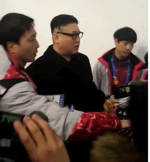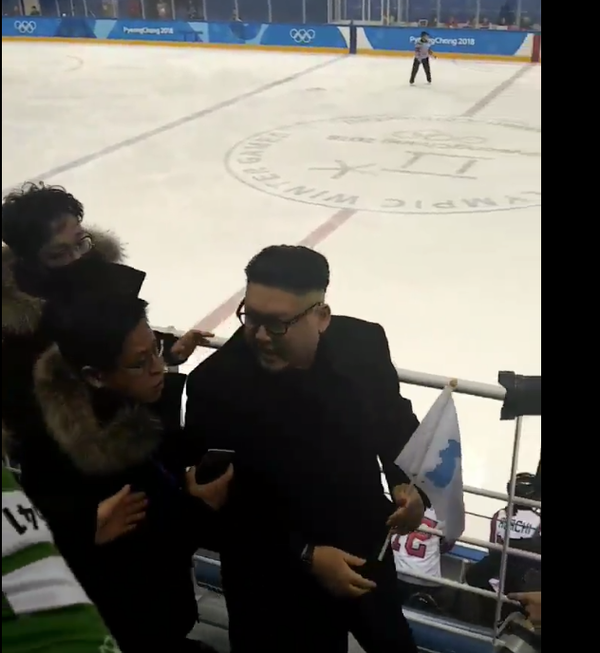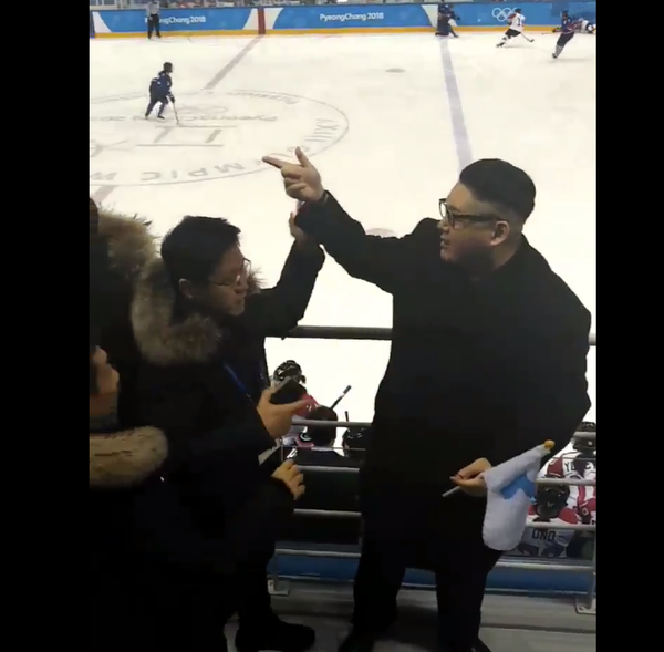 At the united Korea vs Japan womens' hockey game, an apparent Kim Jong-un impersonator starts dancing in front of North Korean cheerleaders. Apparent employees of the DPRK push him aside. He's now sitting nearby giving interviews (in English) pic.twitter.com/PeVJYtri5Y