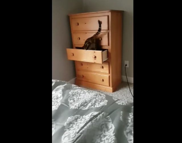 『狭いところ大好き〜!』タンスに閉じこもる不思議な猫ちゃん。
