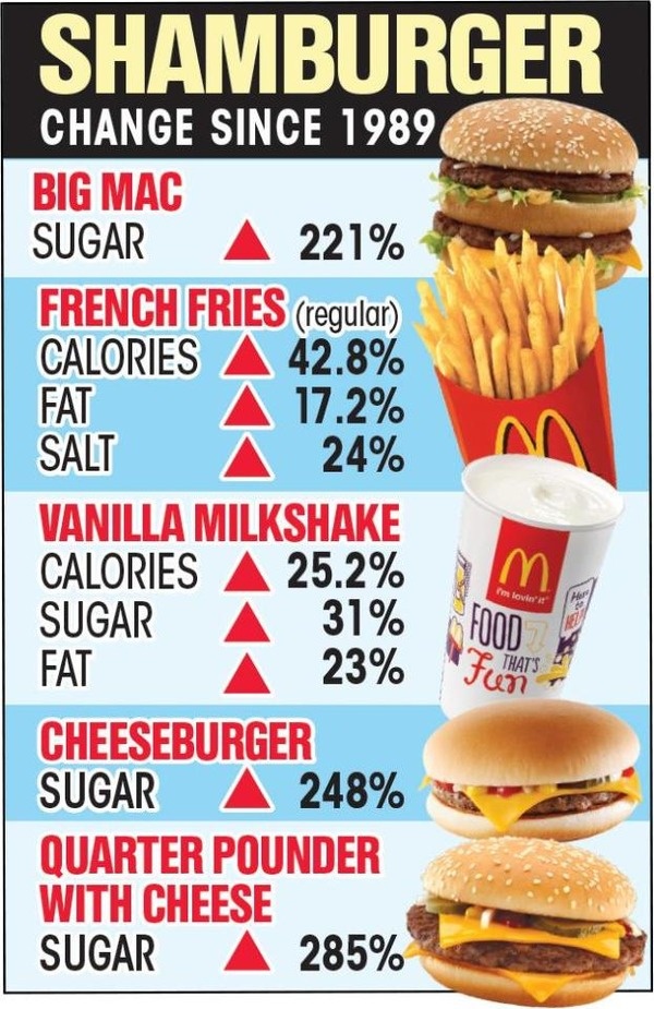 さらにマックフライポテトは、1989年より42%もカロリーが増えているということです。つまり1989年のマクドナルドに比べ現在の商品は、だいぶ栄養素が変わっているということです。