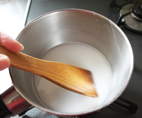 わらび粉13g、水160gを小鍋に入れて火にかけます。水にとけたわらび粉の色は白です。