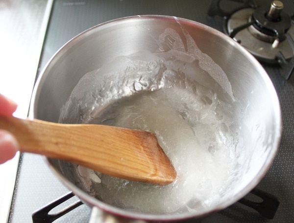 火をつけて、焦げてしまわないように木べらでかき回していると、徐々に固まってきます。そこで安心することなく、透明になるまで根気強くかき回します。