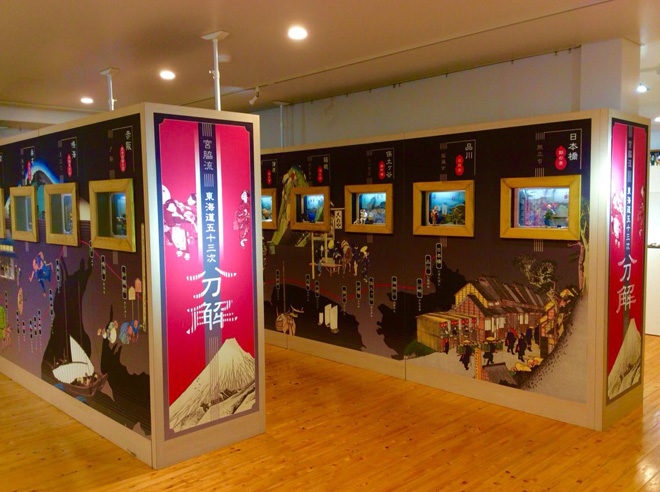 同展ではミニチュアコレクションの他に、西井寿視氏が制作した浮世絵をモチーフにした和紙人形も特別展示。歌川広重の東海道五十三次から、主要な宿場町20箇所を「シャドーボックス」という手法で再現したジオラマも併せて展示されます。シャドーボックスとは、描かれた景色や人物などを切り抜いて、南宋にも重ねて奥行きを表現する手法。2次元の浮世絵が、3次元の立体作品となって登場します。