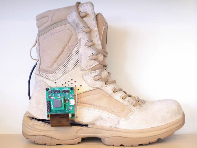 プロトタイプの画像。センサーとプロセッサユニットは開発の利便性のために外部に露出し有線接続されているが、将来的にはブーツに内蔵しBluetoothなどで無線接続することになる。
