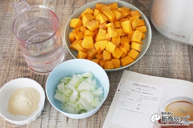 レシピブックの中から、定番のかぼちゃポタージュを作ってみよう。かぼちゃ350g、玉ねぎ50g、水400ml、コンソメ小さじ2を用意。