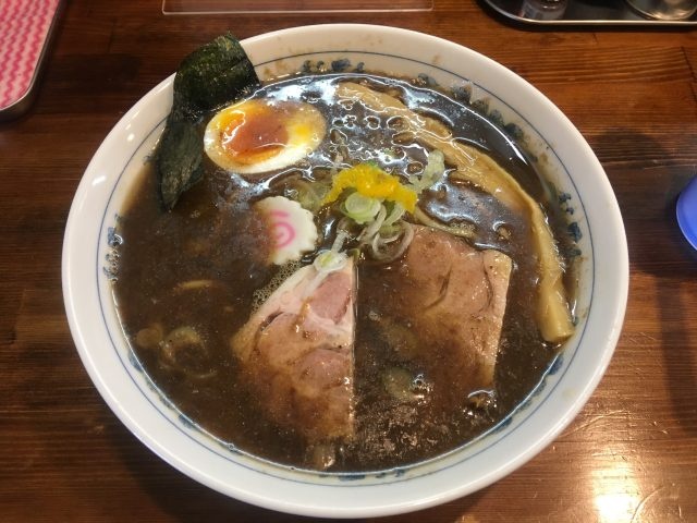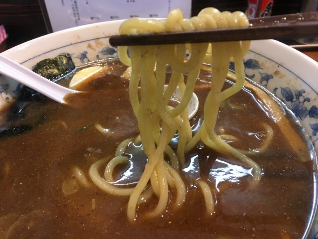 なみなみと注がれた褐色のスープは豚や鶏ガラの出汁をベースに鰹節や鯖節や煮干、またはそれらの魚粉も入っているでしょうか、魚介系の風味を多分に感じます。またラードの油膜も厚めで程よいジャンクさもあり、目新しさはないですが、これは掴まれますね。そこへ絡む自家製の太麺は全粒粉入りのもっちりとした食感で風味も良く非常に食べ応えがあります。