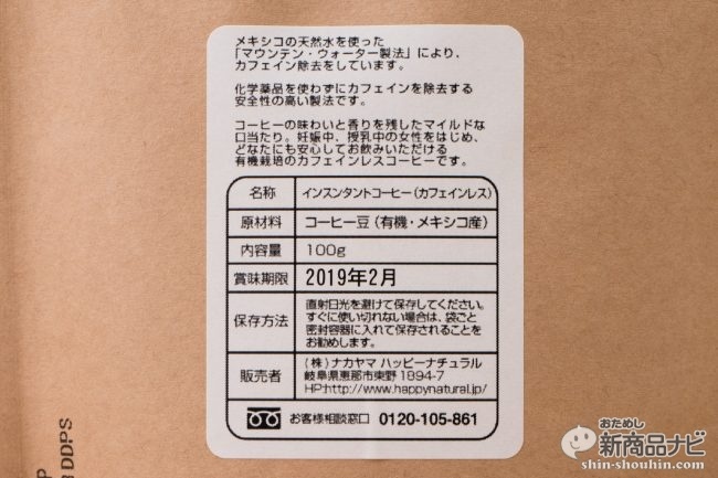 使用されているのは、メキシコ産の有機コーヒー豆。メキシコの天然水をつかった「マウンテン・ウォーター製法」でカフェインを除去しているから、化学薬品不使用で安心! 見た目はさらさらとした粉のよう。香りはあまり強くなく、控えめだ。