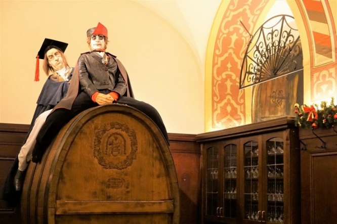 ほかにも「ファウスト」のさまざまな場面が描かれた壁画や、アウアーバッハス・ケラーのシンボル的存在の人形が乗った巨大なワイン樽などが置かれ、見ているだけで楽しめます。