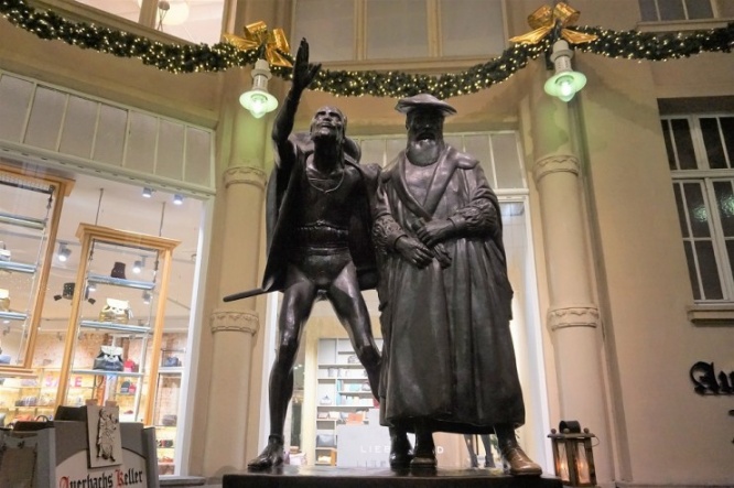 それが、ショッピングアーケード「メードラー・パッサージュ」地下にある「アウアーバッハス・ケラー(Auerbachs Keller)」。入口前に立つファウスト博士とメフィストフェレスの銅像が目印です。