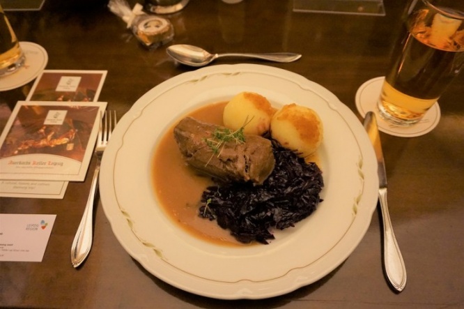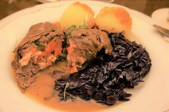 もちろん料理もおいしく、おすすめは「ルーラード(Roulad)」と呼ばれる牛肉巻料理。ドイツのジャガイモ団子「クヌーデル」と紫キャベツとともにいただきます。