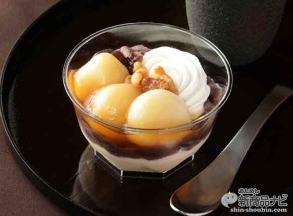 黒蜜ムースの上に、北海道産小豆を使った粒あん・ホイップクリーム・かのこ・クルミ・みたらしたれをかけた餅玉をトッピング。