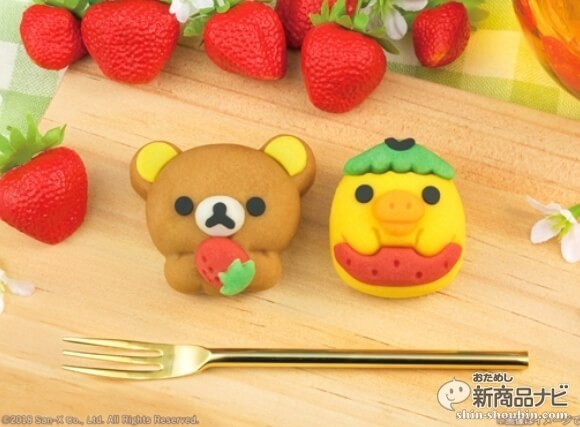 リラックマ15周年に合わせたデザインの和菓子。リラックマはイチゴ味、キイロイトリはハニーメイプル味。