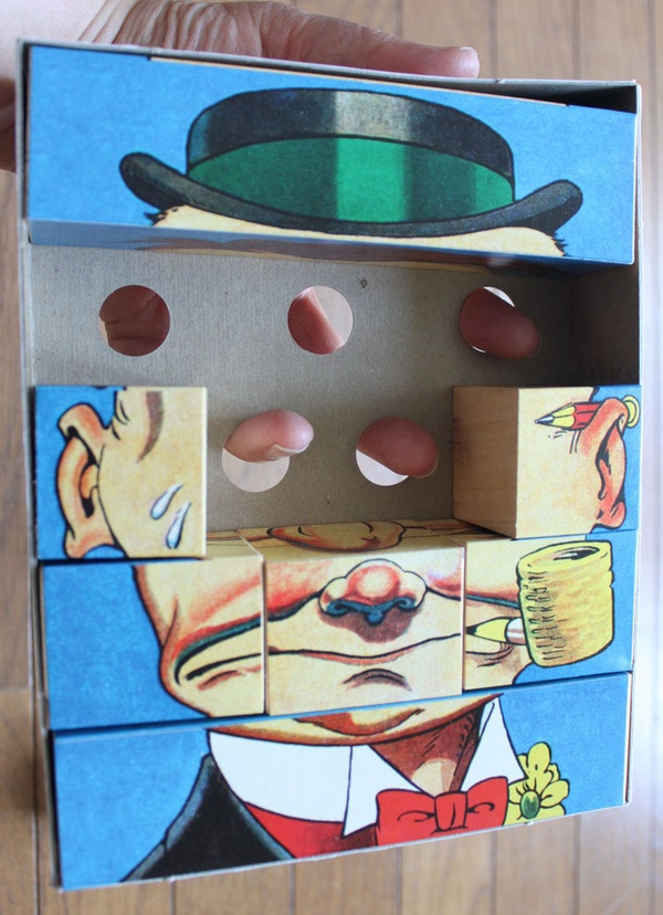 顔の部分を11のパーツに分けて、箱の中に入れられていました。しかも、ひとつのパーツについて、4種類のイラストが描かれています。例えば、頭の部分ならば、緑色の帽子をかぶっている頭、髪の毛のない頭、かわいらしい帽子をかぶった頭、髪の毛のある頭、といった感じです。