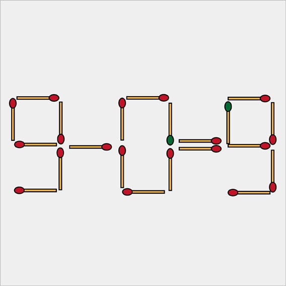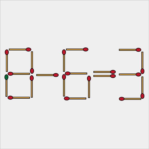 緑色のマッチ棒を”9”のところに移動すると”8”になり、新しく、8-6=3 という式が出来上がりました。せっかくできた式ですが、8-6=2なのですから、この式も正しくありません。移動した場所は間違っていたのでしょうか。
