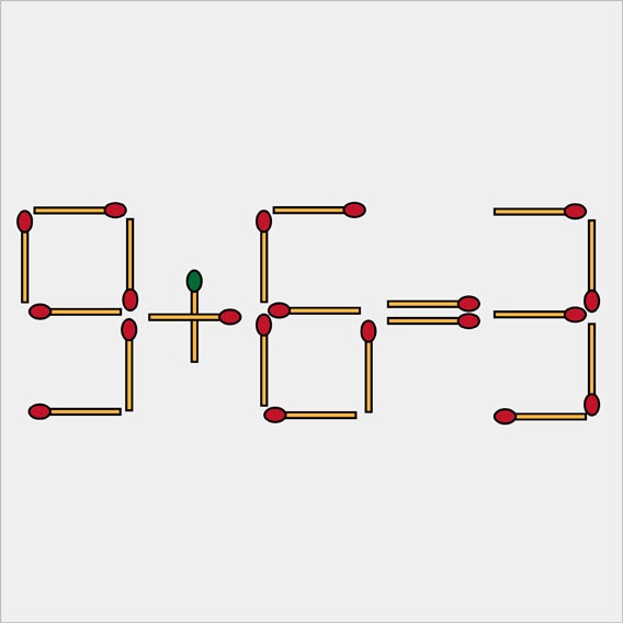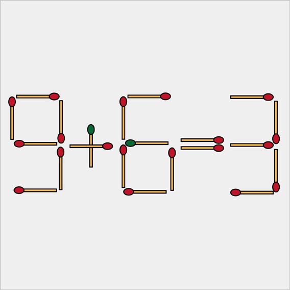 マッチ棒で作った”3”に、マッチ棒を1本加えると”9”になります。まだ移動していない緑色のマッチ棒をここに移動させることができます。