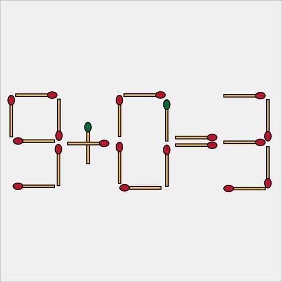 先ず1本だけ移動してみましょう。”6”が”0”になりましたよ。9+0=3。この式は正しくありません。