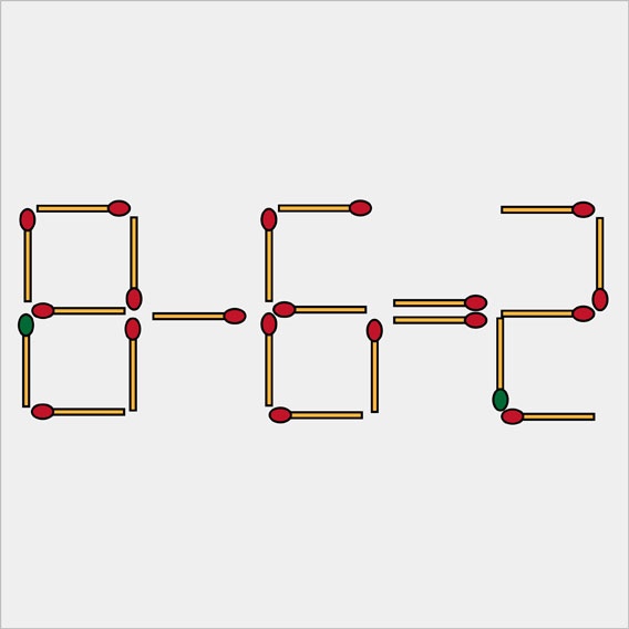 緑色のマッチ棒を移動することにより、3が2になりました。8-6=2となり、正しい式にできました。