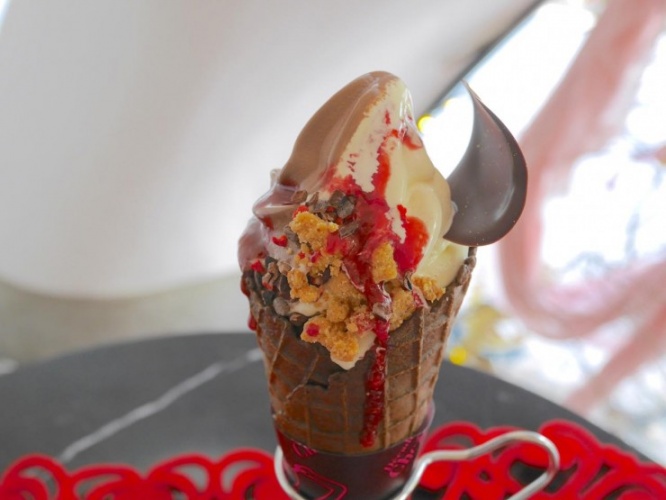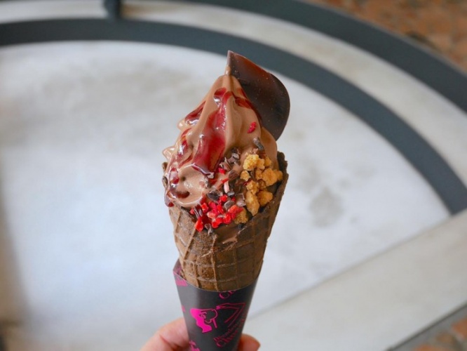 深みのあるショコラのソフトクリームと食べると上品さがアップ!今まで食べたことがない大人のソフトクリームの完成です。