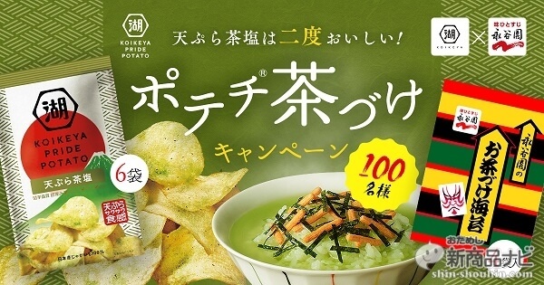湖池屋では『KOIKYA PRIDE POTATO 天ぷら茶塩』の発売に合わせて、株式会社永谷園の「お茶づけ海苔」とのコラボ企画「ポテチ茶漬けキャンペーン」を実施している。一部のユーザーの間で人気の「ポテチ茶漬け」はその名の通りお茶漬けの上にポテトチップスを載せるという禁断のグルメで、両製品を掛け合わせることで相乗効果が生まれるようだ。