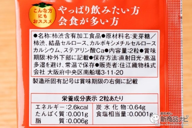 1回分の目安・2錠が個包装されている。柿のサプリメントということで、不思議な香りがするのではないかな、味は大丈夫なのかと心配が募るが実際はどうだろうか。
