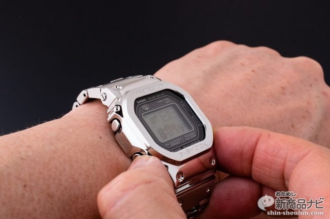 スマートなシルバーボディのためか、デザインはG-SHOCKだがゴテゴテとしたゴツい印象は薄れている。ただ、オール金属製なだけあって、重い……。そろそろ五十路が見えてきたG-SHOCKオールドファンの記者にとっては、これを1日中つけているのは少しつらいかな。体力自慢の元体育会系(アメフトとか)G-SHOCKファンなら、これはバチッとカッコよくキメられるかもしれない。